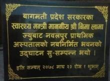ईन्द्रावती गाउँपालिका नवलपुर प्रथमिक अस्पताल १५ शैयाको नवनिर्मित भवन बागमती प्रदेश सरकारका माननिय स्वास्थ्य मन्त्री श्री निमा लामाज्यूको प्रमूख आतिथ्यतमा र गाउँपालिका अध्यक्षज्यूको सभाध्यक्षमा उद्घाटन सम्पन्न ।
