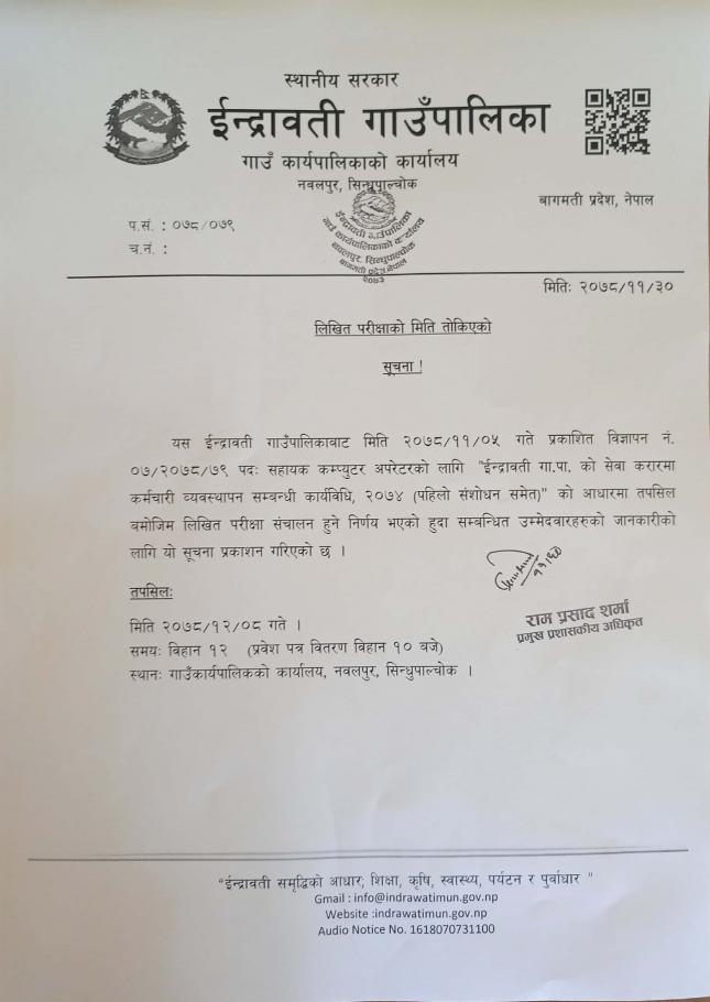 लिखित परिक्षाकाे मिति ताेकिएकाे सूचना ।